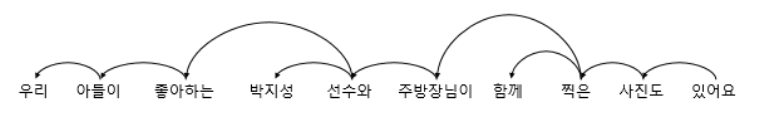 그렇기에 의존 구조가 이렇게 복잡해질 수도 있습니다. 한국어의 경우는 어떨까요? 이 그래프를 보시면 한국어 역시 의존 구문을 분석할 수 있다는 것을 알 수 있습니다.