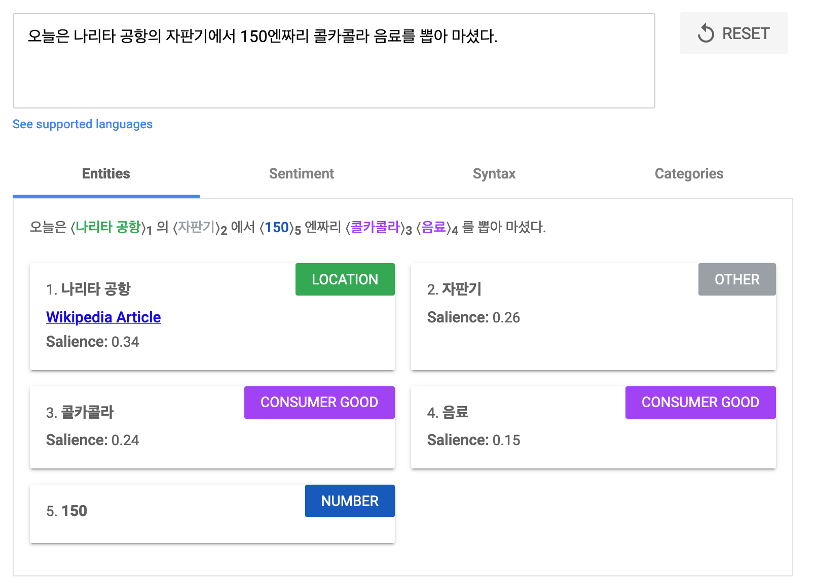 다른 방법으로는 상용화된 API를 활용하는 방법입니다. 예를 들어 구글 클라우드에선 이러한 문장 분석 기능을 다양한 언어에서 제공하고 있습니다. 다만, 일정 콜 이후에는 유료가 된다는 단점이 있습니다.