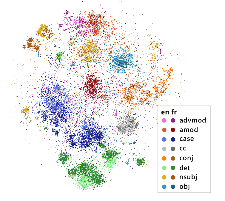 2020년 발표된 이 논문에서는 여러 언어 데이터가 함께 학습된 다국어 mBERT 모델을 분석한 결과, 문장의 의존 구조를 어느 정도 파악하고 있는 것으로 나타났습니다. 더 재밌는 점은 만국 언어 공통의 구조 역시 존재하고, 비슷한 언어 계열일 경우 이 구조가 공유될 수 있다는 점입니다.