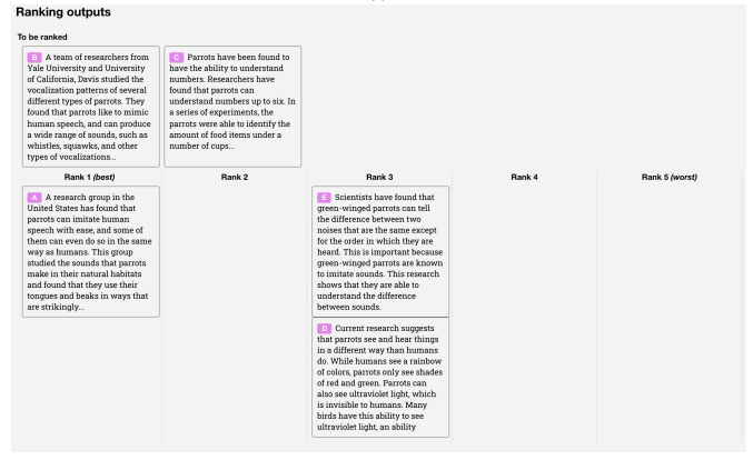 그리고 두번째로 모은 데이터는 GPT가 생성한 답변 후보 여러 개에 크라우드워커들이 점수를 매기는 것입니다. 여러 답변 후보 중에 무엇이 더 좋은 답변인지 랭킹을 매겨 점수화를 하는 방식으로 진행되었습니다.