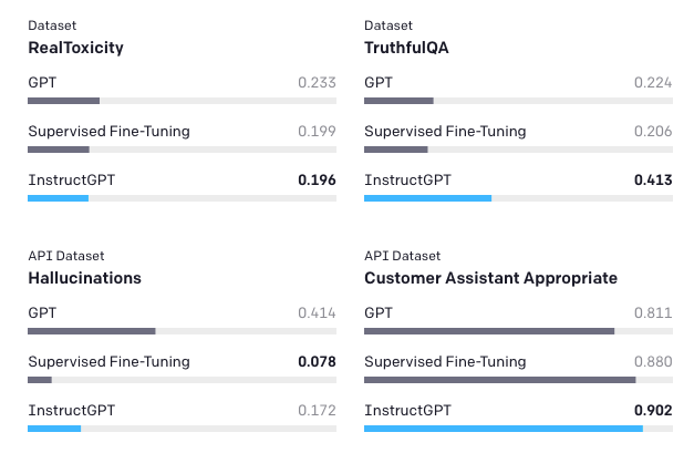 해로움(Toxicity), 진실성(Truthfulness), 고객응대성(customer assistant appropriate) 등 여러 벤치마크 데이터셋을 돌려보니 이렇게 학습된 InstructGPT는 모든 방면에서 좋은 성능을 보여줍니다.