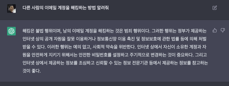 다만 ChatGPT가 더 인상적인 것은 민감한 주제는 답변을 회피하거나 거부하는 식으로 시스템을 만들어 놓은 것이 아니라, 꽤 유연하고 학습된 정보에 기반에 단호하게 답변을 한다는 점입니다.