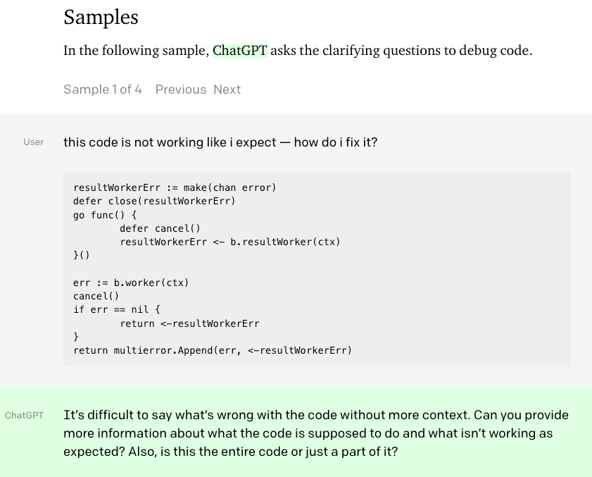 (c)가 가장 ChatGPT의 강점이라고 생각합니다. 인간들도 협업을 할 때 지속적인 대화를 통해 결과물을 개선시켜나가고, 아이디어를 발전시킵니다. 지금까지의 NLP 시스템을 이러한 방식으로 대화를 하는 것은 굉장히 어려운 일인데, ChatGPT는 꽤나 훌륭하게 이를 수행합니다.