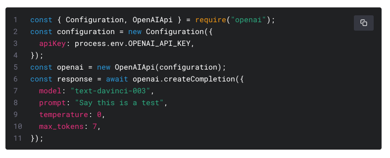 OpenAI의 API는 간단합니다. 어떤 모델(model)인가, 들어가는 인풋(prompt), 그리고 랜덤함을 조절하는 온도(temperature), 최대 길이(max_tokens) 정도 밖에 없죠.