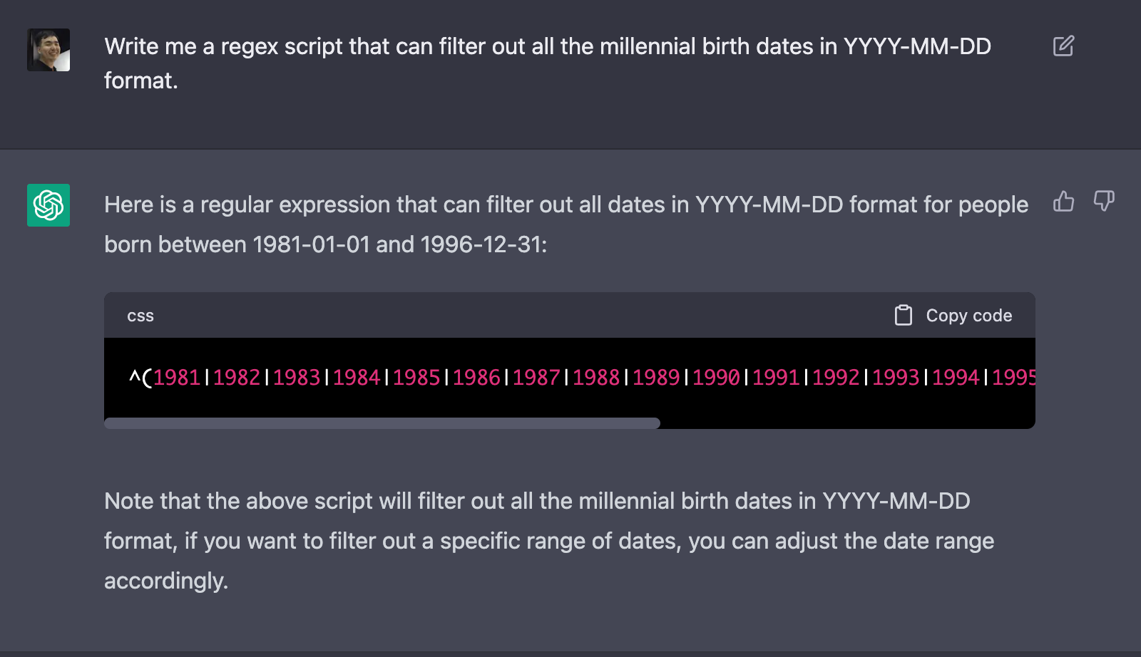 예를 들어, ChatGPT가 잘한다는 Regular Expression(regex) 써주기를 한다고 합시다. 저는 보통 Regex를 Code Editor에서 써야 합니다. 만일 ChatGPT를 써야 한다면 브라우저를 켜놓고 질문을 하겠죠.