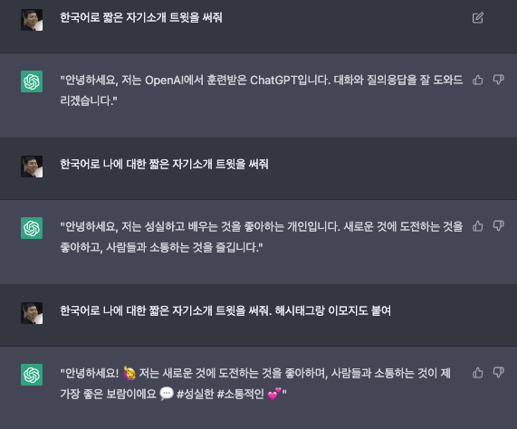 코드를 쓰면 ChatGPT와 질문과 답변을 주고 받는 프로덕트를 만들 수 있습니다. 최근 종종 보이는 ChatGPT 기반 카카오톡, 슬랙 챗봇이 다 이러한 방식을 사용하는 것 입니다.