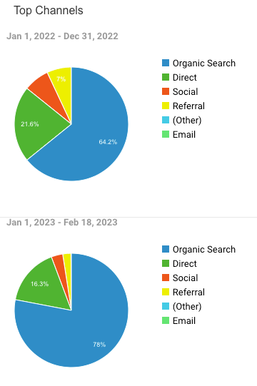 <Weekly NLP>의 이메일 구독자가 4,000명임에도 불구하고, 트래픽의 78%는 2023년에 Organic Search, 즉 검색 엔진을 통해서 왔습니다. 2022년의 64%에 비해 크게 증가한 것은 ChatGPT 덕분 인거 같습니다