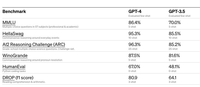실제로 테크니컬 리포트에 공개된 결과에서도 기본 상식 테스트, 독해 능력, 파이썬 코딩 등 GPT3.5에서 4로 갈 때 큰 증가를 보입니다.