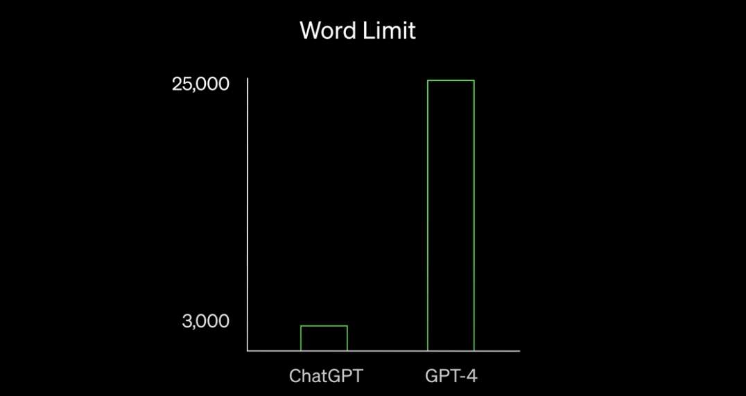 ChatGPT는 3천여개의 단어, GPT-3.5는 8천여개의 단어까지 Input으로 받을 수 있는 반면, GPT-4는 2만5천여개로 늘어났습니다.