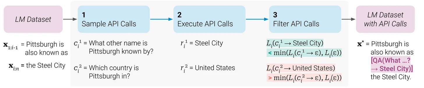 논문 [5]에서는 레이블이 존재하지 않은 (unlabled) 데이터 셋 (Common Crawl의 일부분)에 비슷한 전략을 사용했습니다. 올바른 응답으로 이어지는 API 호출만 데이터 셋에 포함시키는 것이 아니라, 다음 토큰에 대한 LLM의 손실(loss)을 줄이는 호출을 유지했습니다. 대규모 레이블이 없는 텍스트 데이터에 여러 API에서 호출을 사용하는 식의 레이블을 추가로 만들기에는 비용이 많이 들기 때문에 각 API를 언제 선택해야 하는지 알려주는 휴리스틱을 사용하였습니다^.