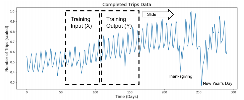 사실 RNN은 NLP 이외의 time series modelling에 굉장히 많이 쓰이는 모델입니다. Time series 시간이 지나면서 변화하는 변수 (variable)를 말합니다. 매 초마다의 주식 거래량, 매 시간의 기온, 매일의 도시의 교통량, 매달의 강수량 등 각 시간마다 바뀌는 값이 있는 데이터를 time series 합니다. 아래 예시는 매 시간의 우버 택시 콜 숫자입니다.