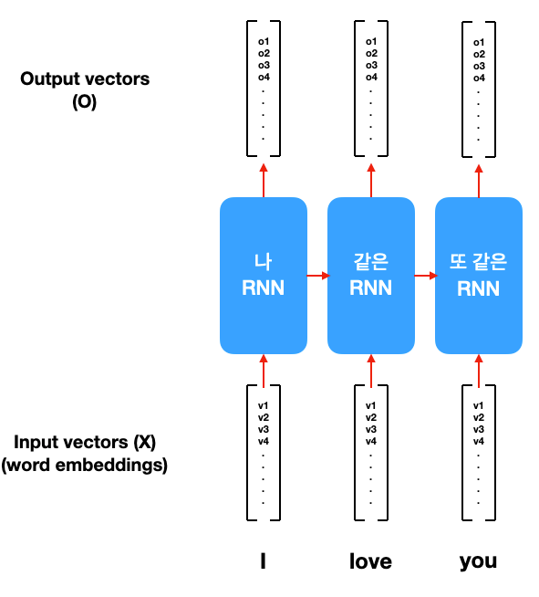 문장은 여러 개의 단어로 이루어져 있습니다. 그렇기에 우리는 단어 한 개를 하나의 input으로 볼 수 있습니다. 위 예시는 "I Love you"이라는 문장을 ["I", "love", "you"]으로 3개의 input vector로 나눈 것을 보여줍니다.