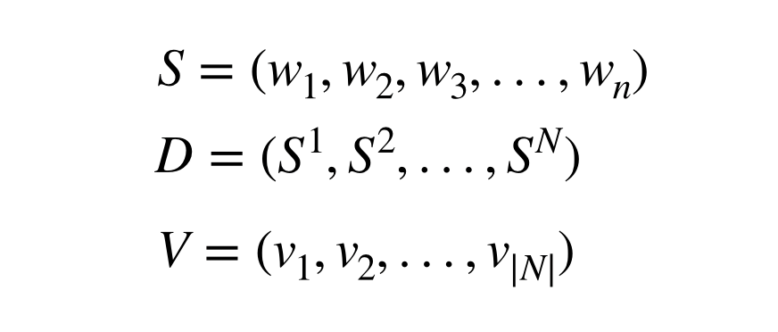 S (Sentence)는 단어 n개가 들어가 연속으로 들어 있는 리스트, w는 문장에 들어가 있는 단어, D는 N개의 문장이 포함된 데이터, 그리고 V는 가능한 모든 단어들의 리스트인 vocabulary입니다. Vocabulary라는 개념을 다시 리뷰하시려면 Week 1을 참고하시길 바랍니다.