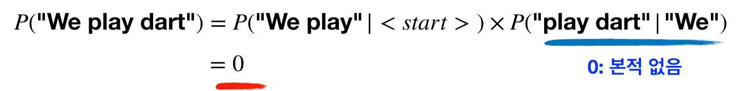 하지만 n-gram LM에서는 이러한 경우가 어떻게 될까요? play dart라는 bi-gram (n=2)은 학습 데이터에 존재하지 않기에, 이 단어 조합이 들어간 문장의 확률은 항상 0으로 수렴하게 됩니다.