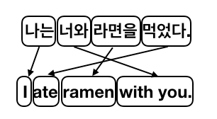 만약 여기까지만 한다면 이러한 불완전한 번역으로 끝나겠죠? 이는 바로 언어마다 주어 (subject)와 동사 (verb), 그리고 목적어 (object)의 순서가 다르기 때문입니다. 이를 어순이라고 하는데, 세상 언어에는 한국어 같은 SOV형 또는 영어 같은 SVO형이 대부분이지만 아닌 언어들도 간혹 가다 있습니다.
