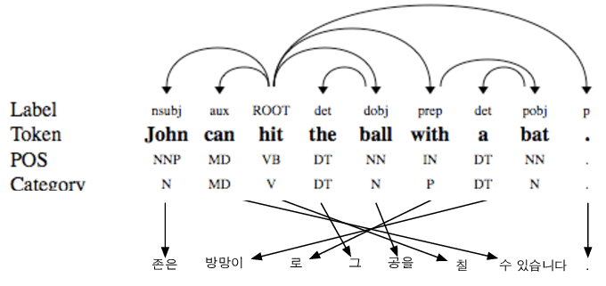 여기서 좀 더 나아가면 의존 구조 분석(dependency parsing)이 사용되기도 합니다. 어떤 부분이 주어고, 동사고, 목적어고, 그 관계가 어떻게 되고 등등 문장을 분석하는 것인데요. 만약 단어가 늘어날수록 가능한 순서가 너무나 빠르게 (단순하게 모든 조합을 생각하면 factorial급으로) 늘어나기 때문에, dependency label을 가지고 조금은 쉽고 효율적으로 순서를 찾아보려는 방법입니다.
