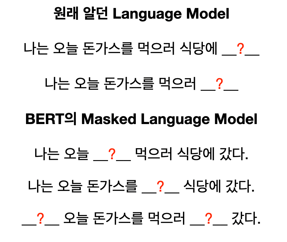 위 예시와 같이 MLM은 좀 더 다양한 방식으로 문장을 학습할 수 있습니다. 그렇기 때문에 모델이 문장과 단어들에 대한 좀 더 앞뒤로 복합적인 이해 능력을 가질 수 있습니다. 이렇게 차별성을 둘 수 있는 이유는 다 Transformer가 앞뒤를 모두 볼 수 있는 모델이기 때문입니다. 그전에 RNN은 한 방향으로만 돌아볼 수밖에 없었죠.
