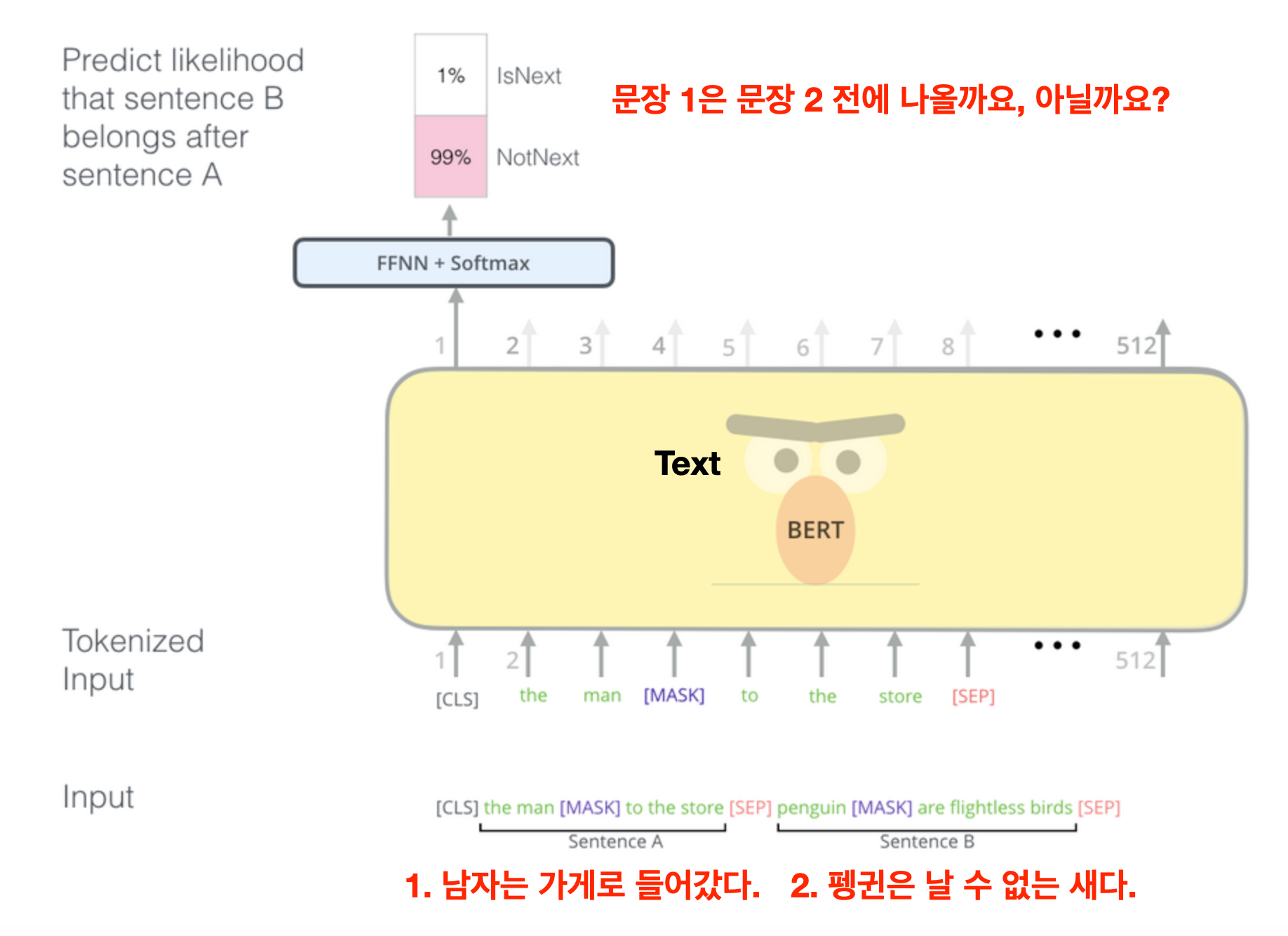 아마 제대로 쓰인 글이라면 "남자가 가게를 들어갔다" 다음에 "펭귄은 날 수 없는 새다"가 나오지는 않겠죠. 이런 식으로 BERT는 두 문장이 있을 때 단어들과의 관계, 문장 두 개 간의 관계를 학습합니다.