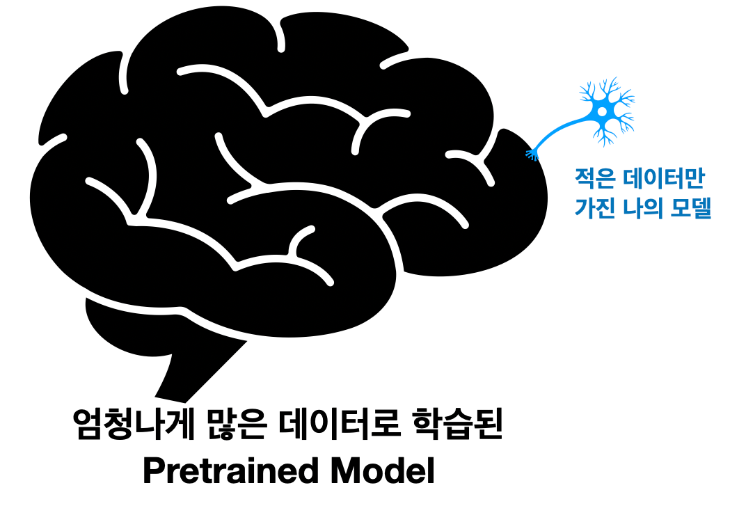 이처럼 많고 유사한 데이터로 미리 학습된 모델을 Pretrained Model이라고 합니다. Pretrained Model을 잘 선택해서 활용하면 더 적은 데이터로도 같거나 뛰어난 성능을 이루어낼 수 있습니다. 그렇기 때문에 최근 머신러닝 모델들은 백지부터 시작하는 경우가 거의 없습니다. 그 분야에서의 pretrained model이 무엇이 있는지 잘 파악하고, 거기서부터 시작해야 합니다. 특히 요즘은 지난주 소개한 BERT와 같이 구글이나 페이스북 같은 대기업에서 엄청나게 많은 데이터와 컴퓨팅 파워로 학습된 모델을 공개하기 때문에 어떠한 것들을 사용할 수 있는지 파악하는 것이 매우 중요합니다.