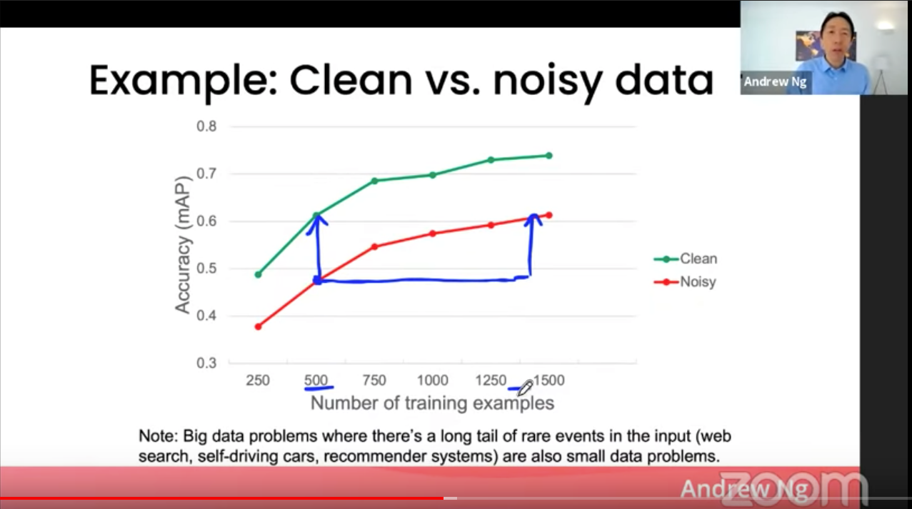 2) 반대로 데이터가 적으면, 라벨의 일관성과 질이 모델 퍼포먼스에 큰 영향을 끼친다. (=Garbage in, Garbage out)