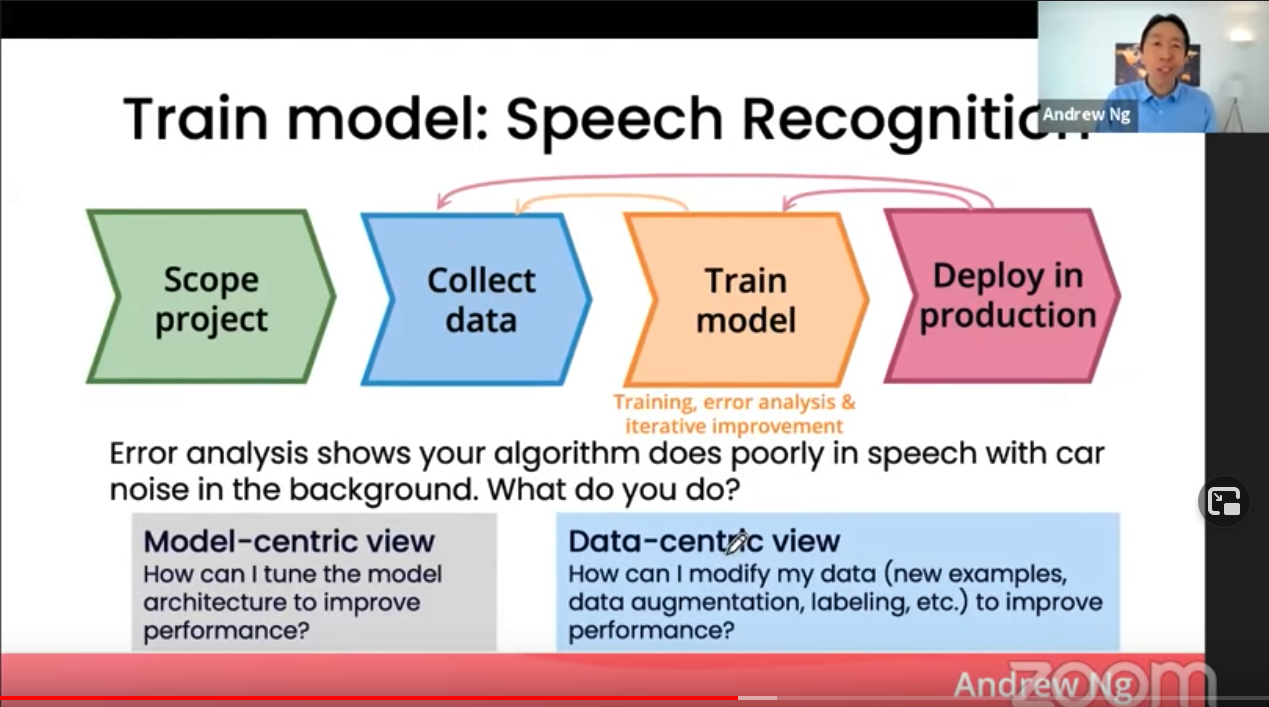 이러한 생각이 스멀스멀 제 머리 속에 쌓일 때 때마침 코세라(Coursera)의 머신러닝 강의로도 유명한 앤드류 응(Andrew Ng) 교수님이 2021년 3월 25일, 머신러닝 시스템 개발: 모델 중심에서 데이터 중심으로 을 진행하였습니다.