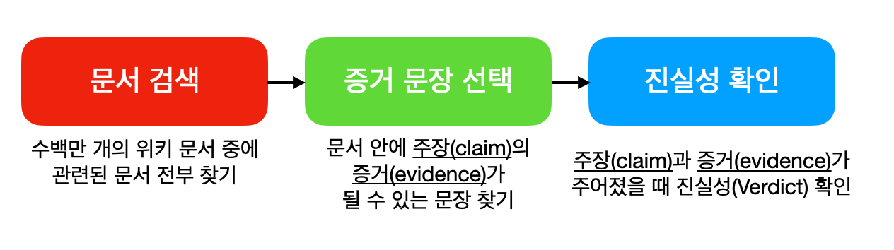 Thorne et al. 은 이 FEVER 데이터셋을 사용하는 Shared Task를 만들고, 다음과 같은 팩트체킹 파이프라인을 여러 개의 모듈(module)로 정의합니다.