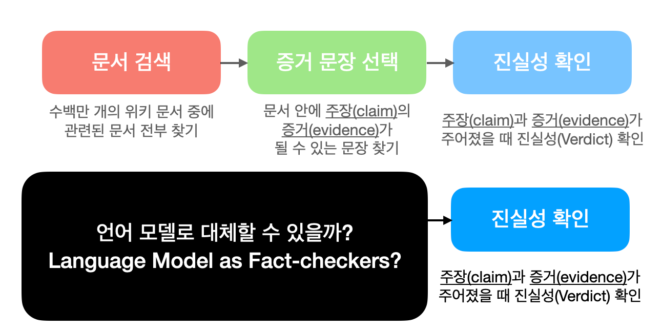 이 논문을 보며 "이러한 LM 의 능력을 사용해서 팩트체킹 파이프라인 모듈들을 단순화시키면 어떨까?" 란 생각을 하게 되었습니다.