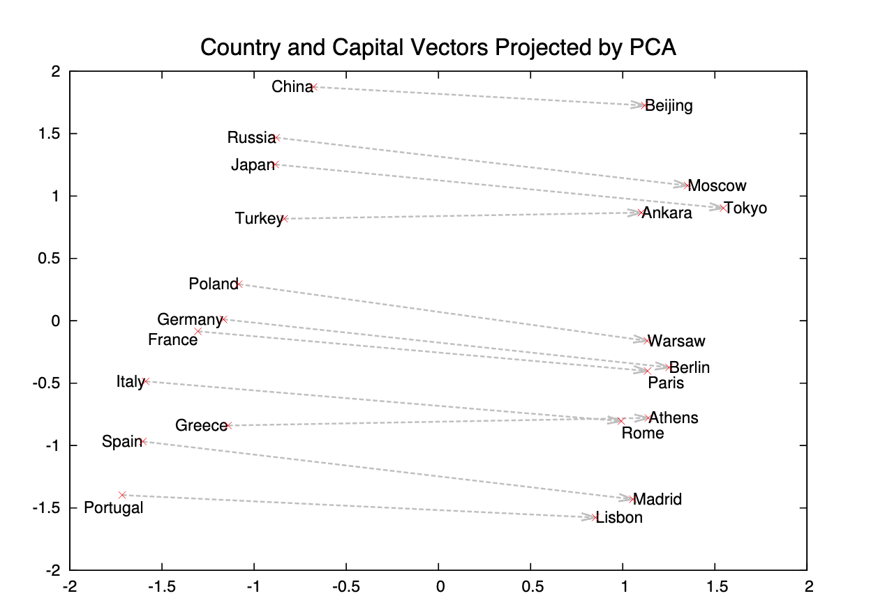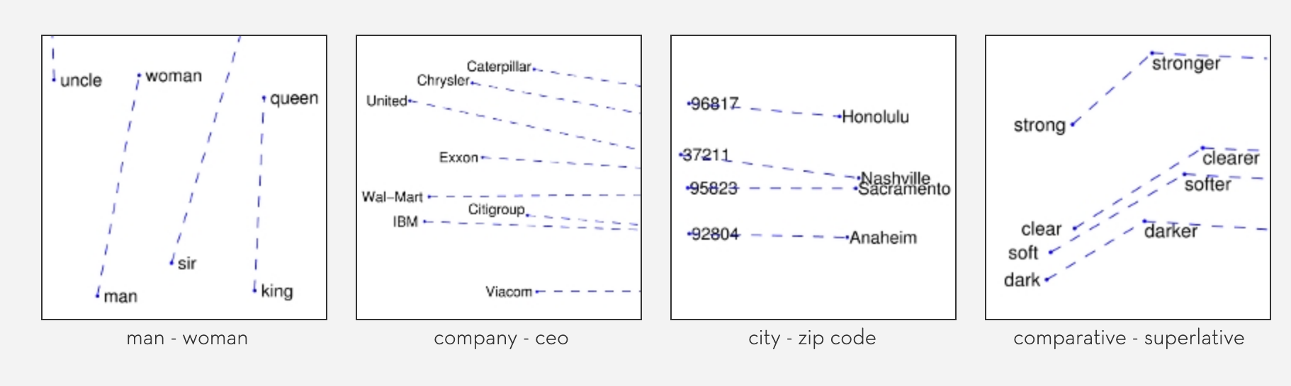 위 예시와 같이 단어의 성별 관계, 회사와 CEO 이름의 관계, 도시와 ZIP code의 관계, 그리고 형용사의 변형 (ex. dark, darker, darkest)까지 vector의 방향성에 encoding이 되어있다는 것을 알 수 있습니다.