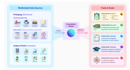교육에도 기초 모델이 활용될 수 있을까요? 현재 가장 많이 활용되는 AI 기술은 "학생의 현재 수준 파악"을 위한 Knowledge Tracing입니다. 여태까지 푼 문제 중 무엇을 제대로 맞추었는지 틀렸는지를 보고 현 학생의 수준을 파악하고 다음 문제는 어떨지 예측하는 문제입니다. 이를 통해서 무엇을 더 보완하고 공부해야 할지 추천 시스템을 짜는 개인화된 커리큘럼(adaptive curriculum design)을 만들 수가 있습니다.