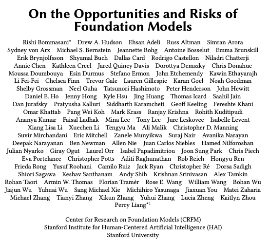 이러한 질문들에 답하기 위해 수많은 AI/ML/NLP 전문가 뿐만 아니라, 철학/법률/의학/교육 전문가들이 뭉쳐 엄청난 논문을 한 편 집대성하였습니다. 기초 모델들의 기회와 리스크들 (On the Opportunities and Risks of Foundation Models) 이라는 제목을 가진 이 논문은 무려 212 페이지나 되지만, 놓칠 부분이 없는 글이었습니다.