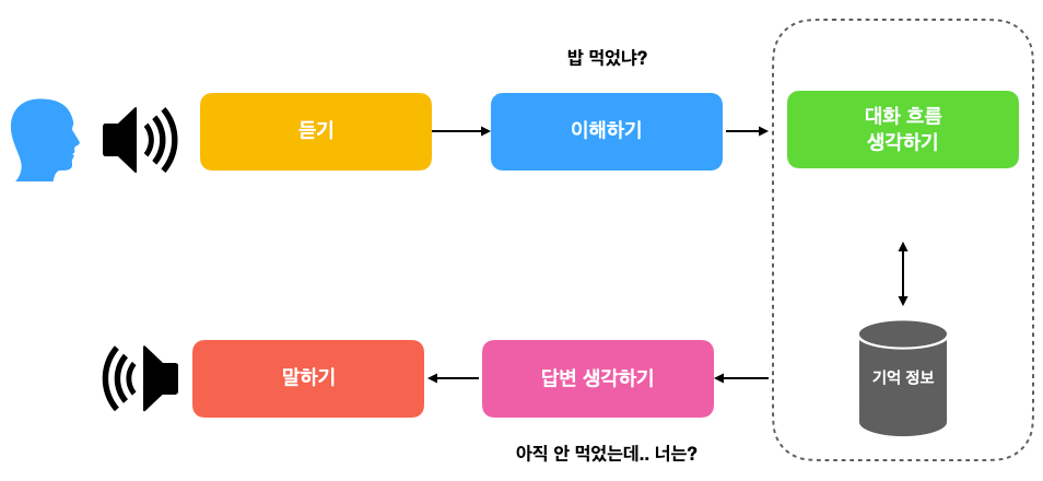 이처럼 우리가 친구가 "밥 먹었냐"라고 했을 때 대응할 때 이처럼 많은 정보 처리가 이루어집니다. (일상대화가 가능하신 분들은 본인의 지능에 감탄하셔도 좋습니다.)