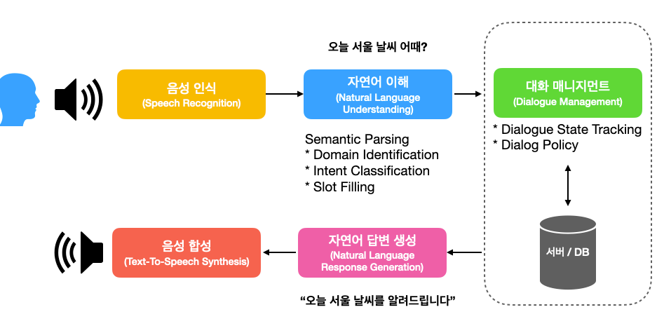 AI 스마트 스피커에게 "오늘 서울 날씨 어때?"라고 했을 때 어떻게 처리되고 있는지 한번 살펴봅시다.