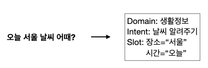슬롯(Slot)은 유저의 니즈를 해결해주기 위해 필요한 정보. 예를 들어, "오늘 서울 날씨 어때?"에서 장소="서울", 시간="오늘", 두 가지 슬롯이 포함되어 있음.