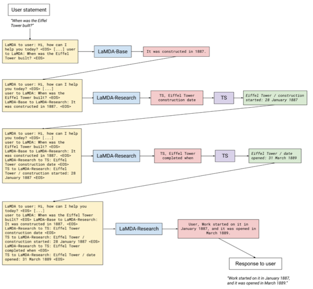 아래 예시는 "에펠탑은 언제 지어졌니?"라는 유저 질문에 답을 하는 LaMDA 작동 예시입니다.