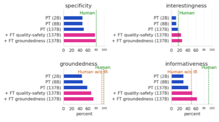 이런 식으로 보강된 LaMDA (+FT groundedness)는 평가에서도 기본 LaMDA (PT)보다도 진실성(groundedness)과 정보성(informativeness)에 좋은 성능을 보인다는 것을 알 수 있습니다. 심지어 구체성(specificity)와 흥미성(interestingness) 점수도 증가하였습니다.
