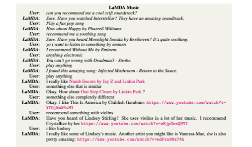 음악을 추천하는 챗봇으로 LaMDA를 변신시킬 때에는 조금 다른 방법을 사용합니다. 단순히 "난 음악 추천 챗봇이야" 같은 대사를 미리 주는 것이 아니라, 위에 나온 대화를 전부 input 예시로 붙여 넣어주었습니다. 위에 나온 대화는 실제로 LaMDA가 생성한 것이 아니라, 엔지니어가 미리 짜놓은 각본인 셈이지요.