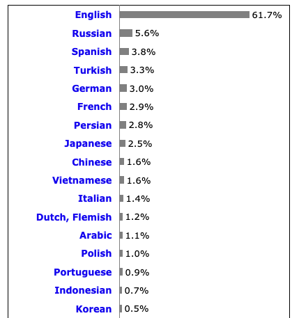 NLP 모델, 특히 언어 모델의 대부분의 학습 데이터는 인터넷에서 모아 사용하고 있습니다 (Week 29: GPT 편 참고). 인터넷은 압도적으로 영어 (61.7%)로 된 텍스트가 많습니다. 한국어는 17위로 0.5% 밖에 되지 않습니다.