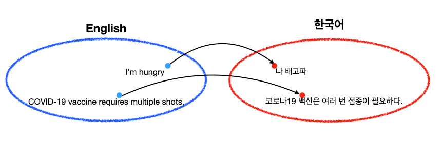 하나의 문장을 하나의 벡터 공간의 점이라고 보았을 때, “영어"라는 공간의 점에서 “한국어"라는 공간으로 치환하여 알맞는 점의 문장을 찾아내는 문제가 바로 기계 번역입니다.