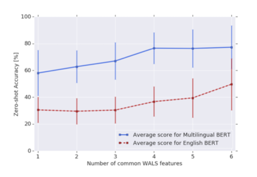 놀랍게도 mBERT는 언어 간 특성을 잘 학습하였습니다. 심지어 아랍어, 한국어, 일본어 같이 알파벳이 아닌 문자를 써 영어와 겹치는 단어가 없는 언어에도 효과적인 성능을 보입니다.